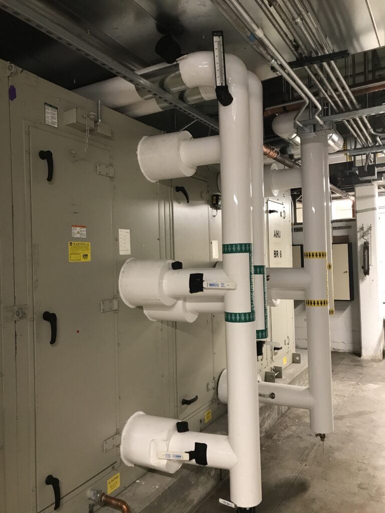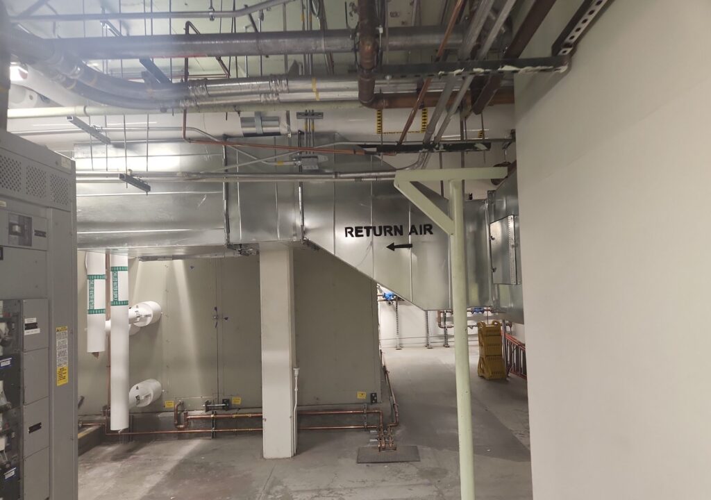 The scope of this project included the demolition four Air Handling Units. Existing Variable Air Volume (VAV) boxes downstream of AHU-BR-09 will be replaced and new ductwork was required. A new exterior roll-up door and stairs will be added for maintenance access. The existing Motor Control Center (MCC) was demolished, and all circuits were moved over to another MCC (MCC-A).