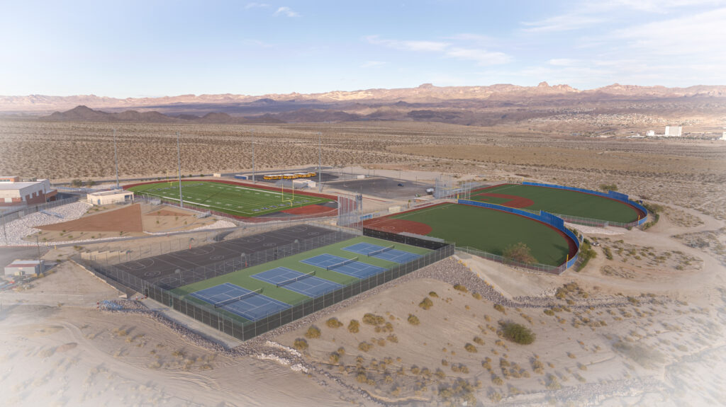 Conversion of a 9.71 acre CCSD sports field area from natural grass to artificial sports surfaces. The project includes two baseball fields and range for shot put and discs. Also the entire site was improved by new back stops, fencing, and multiple ADA upgrades which provide access to multiple fields. In addition the project design mitigated a latent flooding problem caused by an original design that did not account for heavy rain fall on the alluvial fan where the school was built.