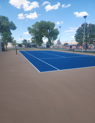 Selective demolition of existing concrete on both east and west courts to grind/prepare existing sub-strate to support new tennis court post-tension overlay. Existing CMU block hitting wall to be removed including foundation. Selective demolition requires removal of existing court concrete @ hitting wall and all fence and post foundations where existing fence and sports posts will be entirely replaced with new. Existing sidewalk flatwork shall be removed in order to provide new 5% maximum accessible sidewalk to court entry. New 5″ post-tension concrete overlay on entire east and west court. Contractor shall provide all new foundations, in-fill concrete and rebar at all new sports posts, new hitting wall and new perimeter fence. Contractor shall provide new accessible sidewalk to meet new increased height at 5% maximum slope. New sports equipment & fencing materials are contractor provided including all netting to provide a fully functioning tennis court (east) and basketball/pickle ball court (west). New performance sports surface coating (slip-resistant) to be applied to the east ‘tennis’ court only with the west ‘basketball/pickleball court to be broom-finished concrete.